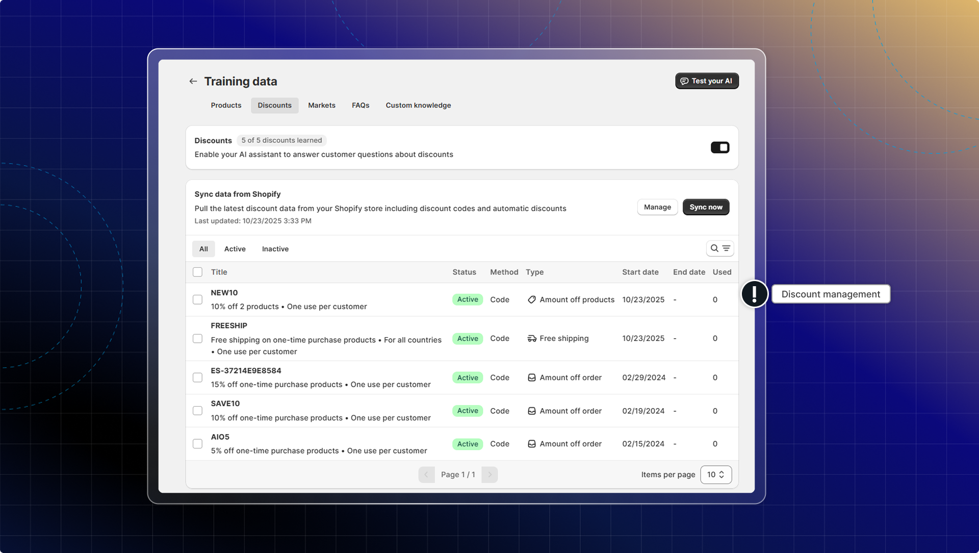 All discounts available in your Shopify store are synced to AI training data. (both active & inactive)