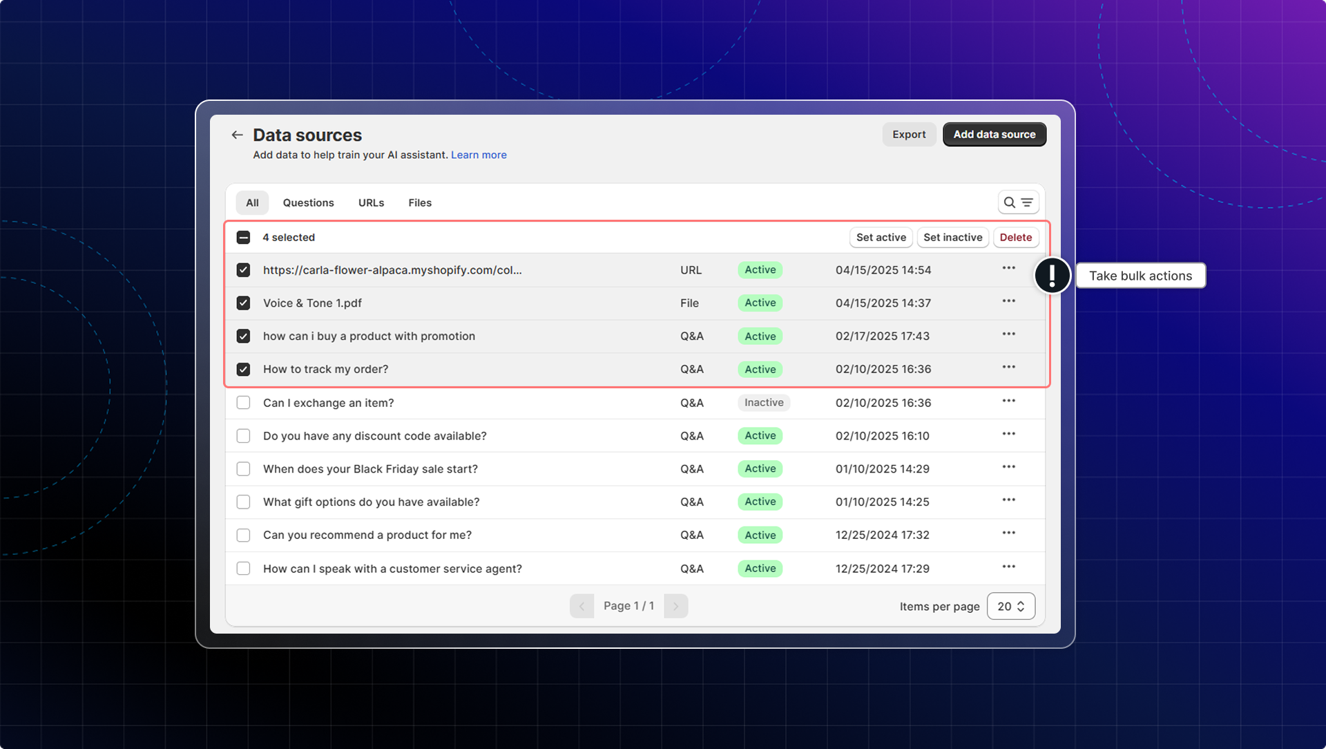 You can select multiple data sources and take bulk actions: set as active, set as inactive, or delete.
