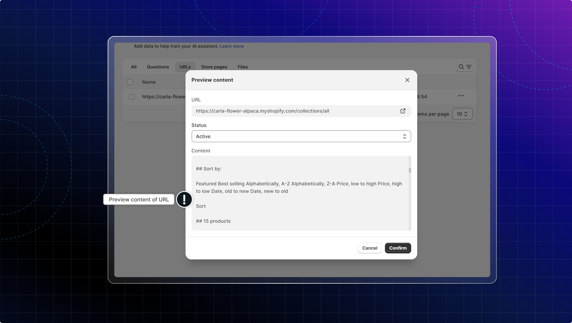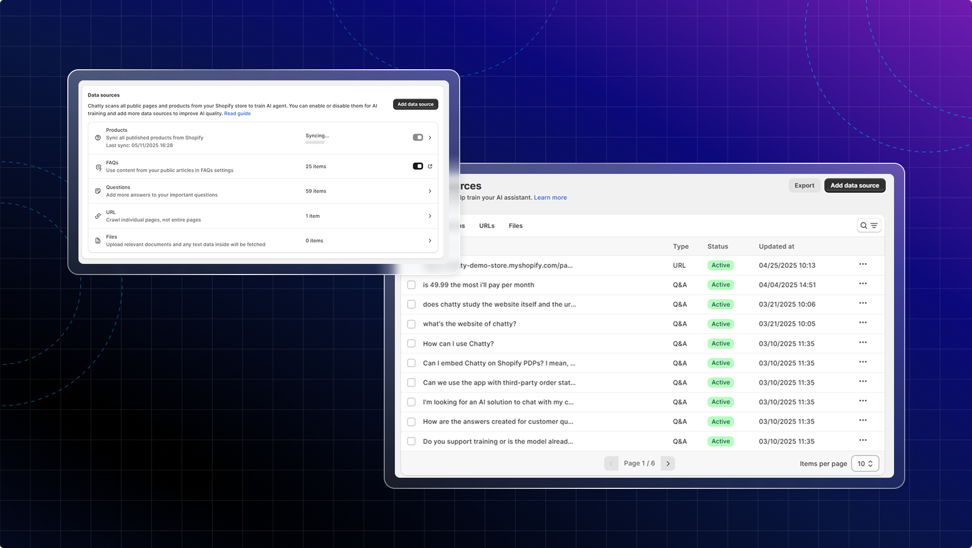 If your Shopify pages are not auto-synced to data sources, go to Data sources → Click Sync store pages or re-activate AI.