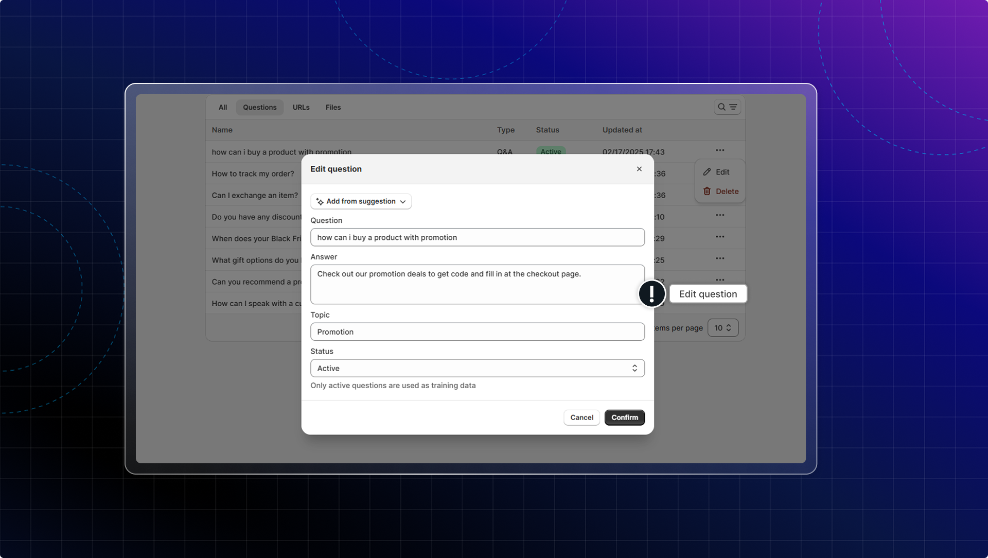 You can delete, edit details, or change the status Active/Inactive of each question.