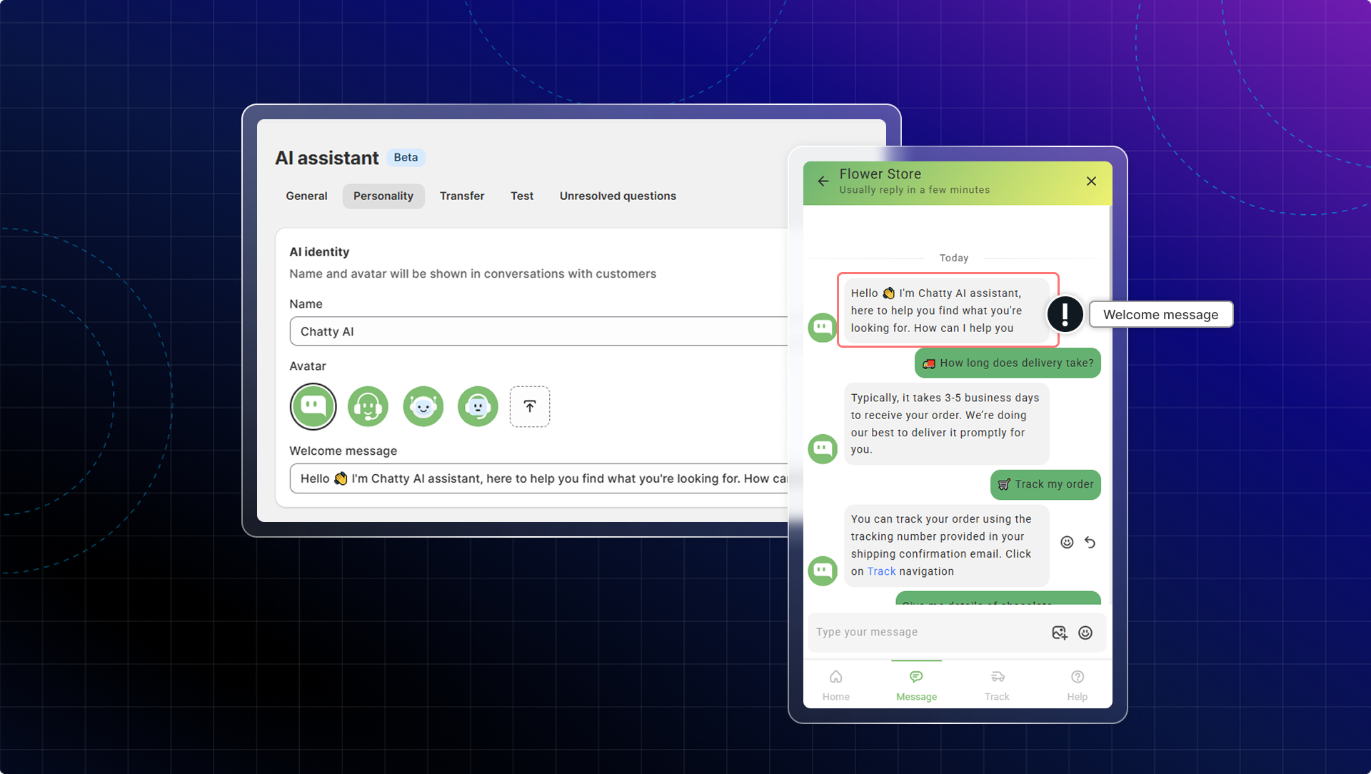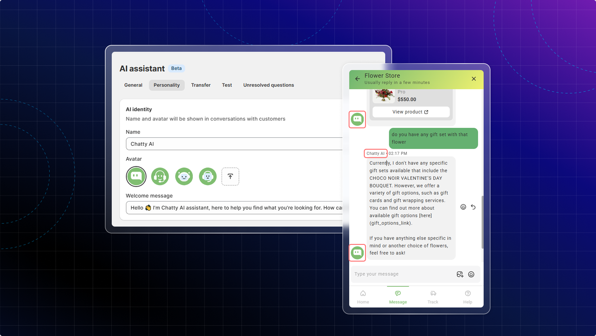 You can give a specific name and avatar for your AI assistant. This will be shown in the chatbox.