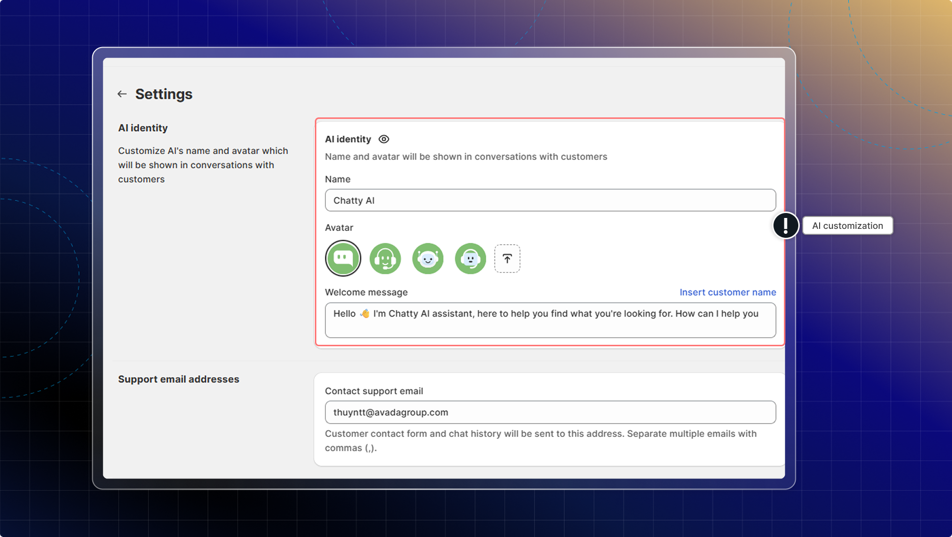 - Welcome message: Customize the first message customers see when interacting with your AI