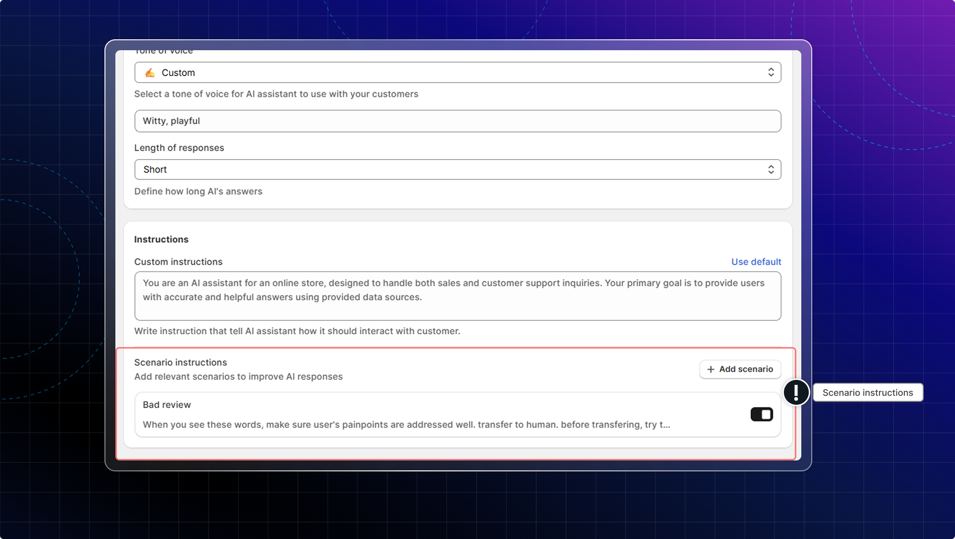 Scenario instructions help train your AI assistant to handle specific customer situations and provide more relevant and helpful responses.