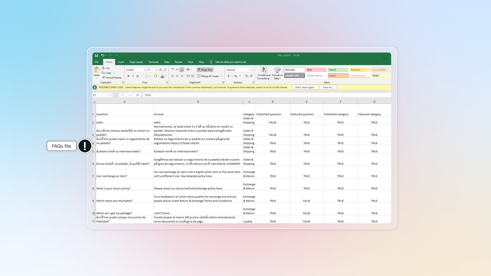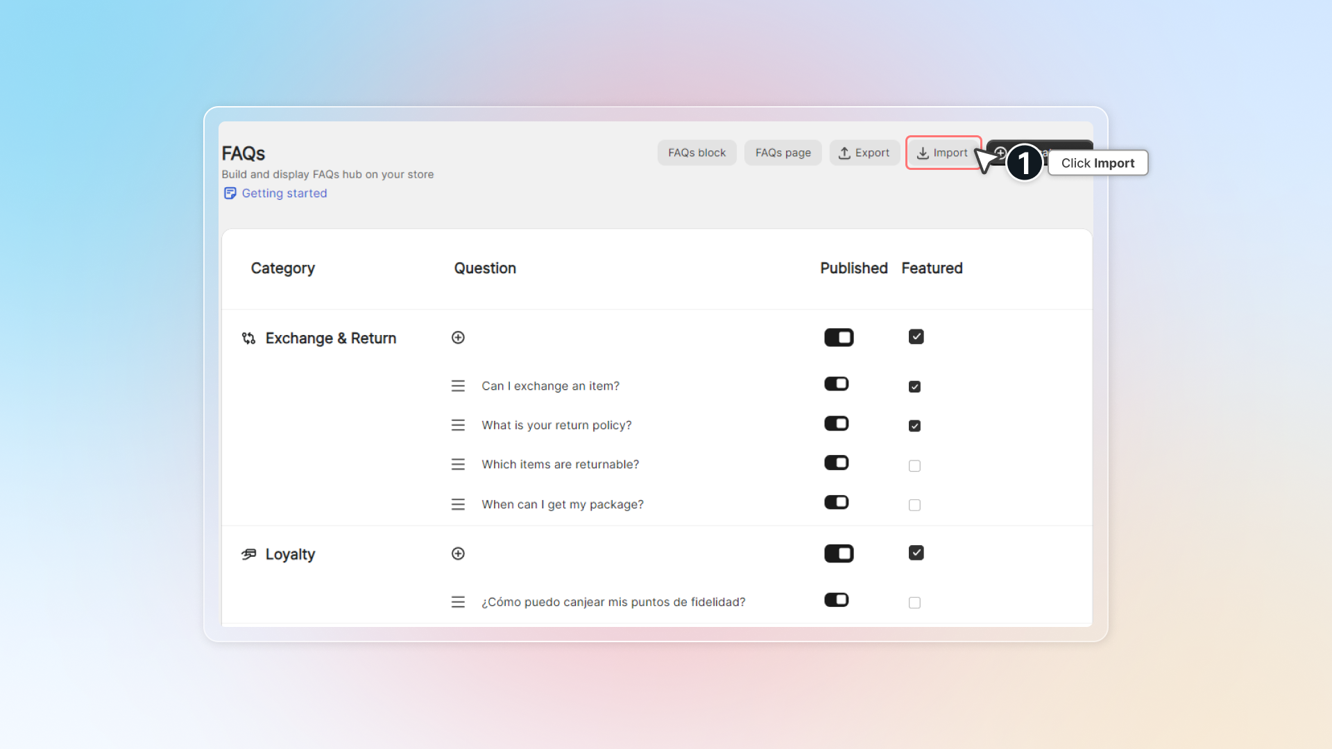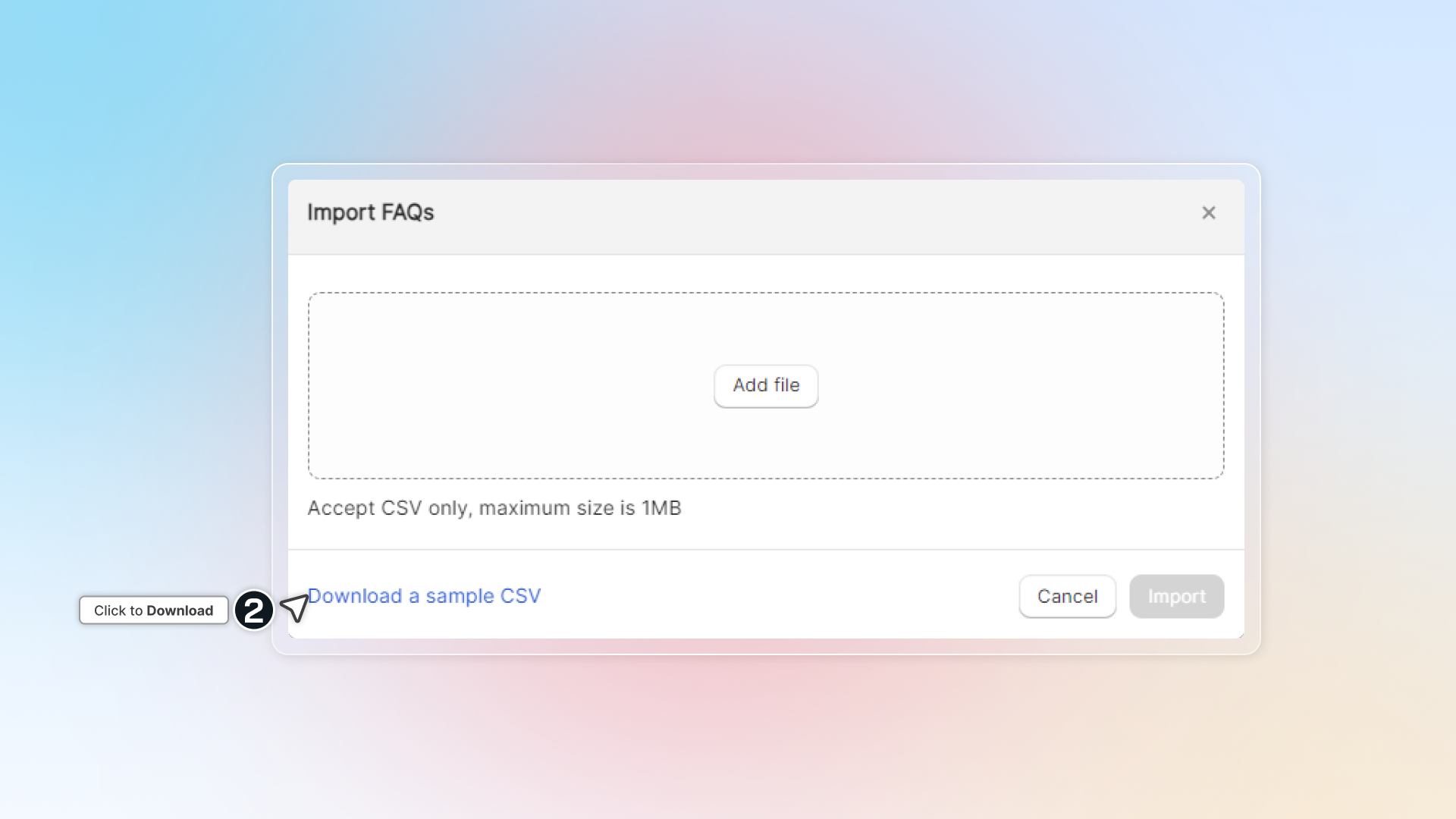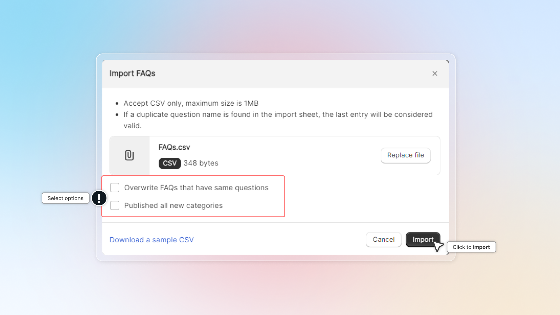 Go to FAQs → Select More actions → Click Import FAQs → Download a sample CVS