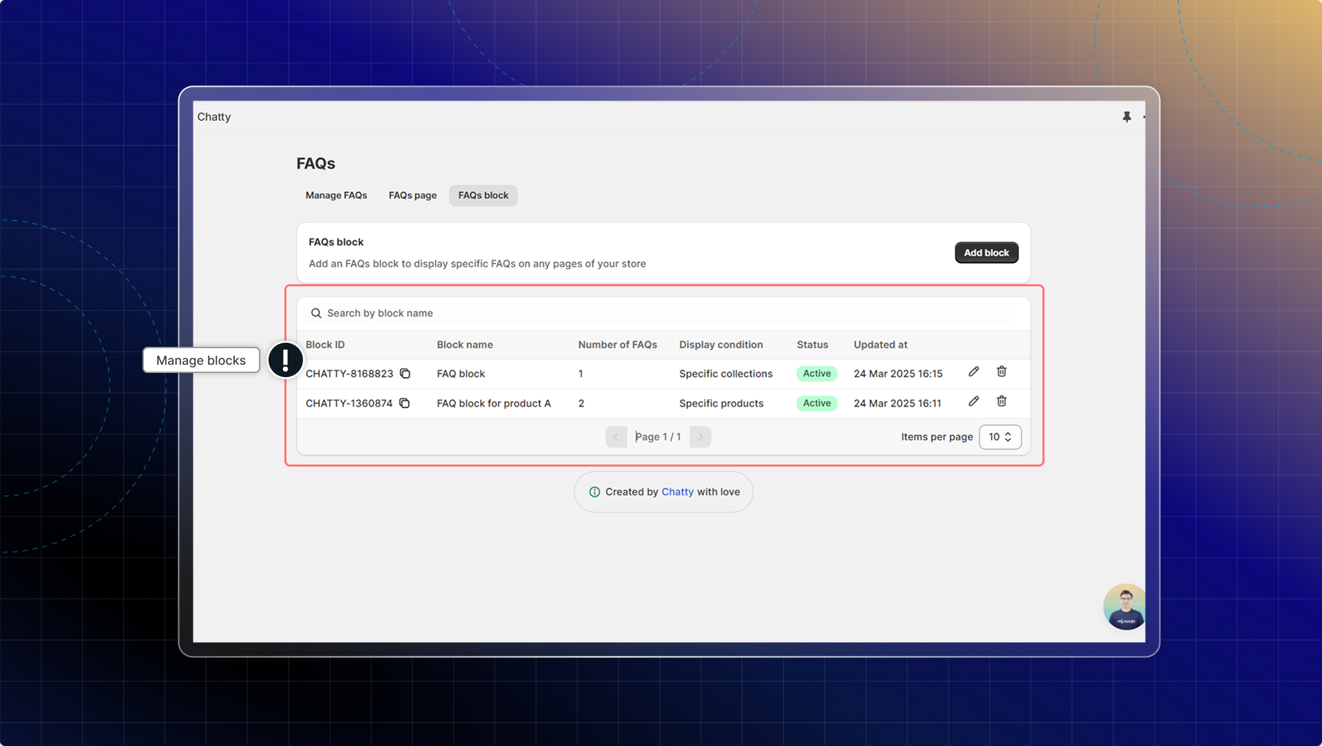 - See details including Block ID, Block name, Number of FAQs, Display conditions, and Status