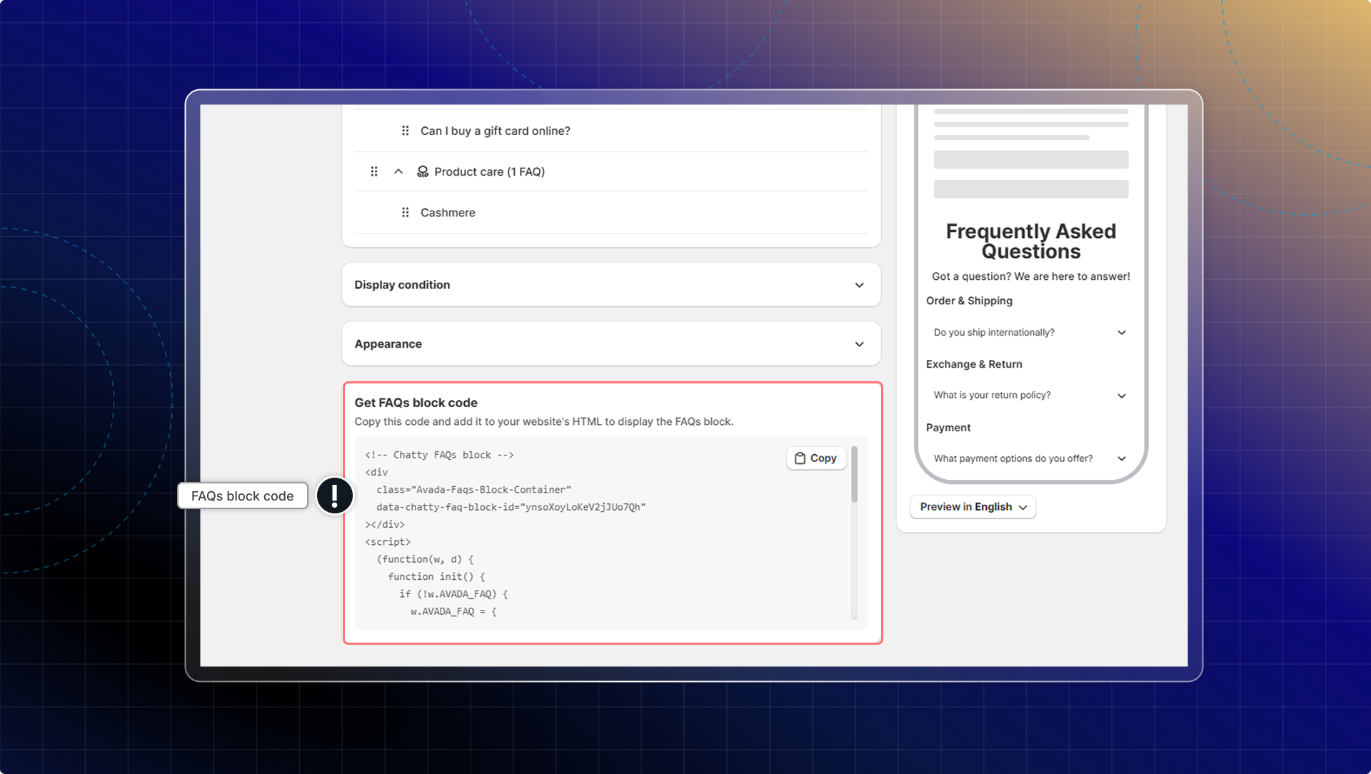 Go to FAQs block code → Click Copy → Add to your website's code (HTML)