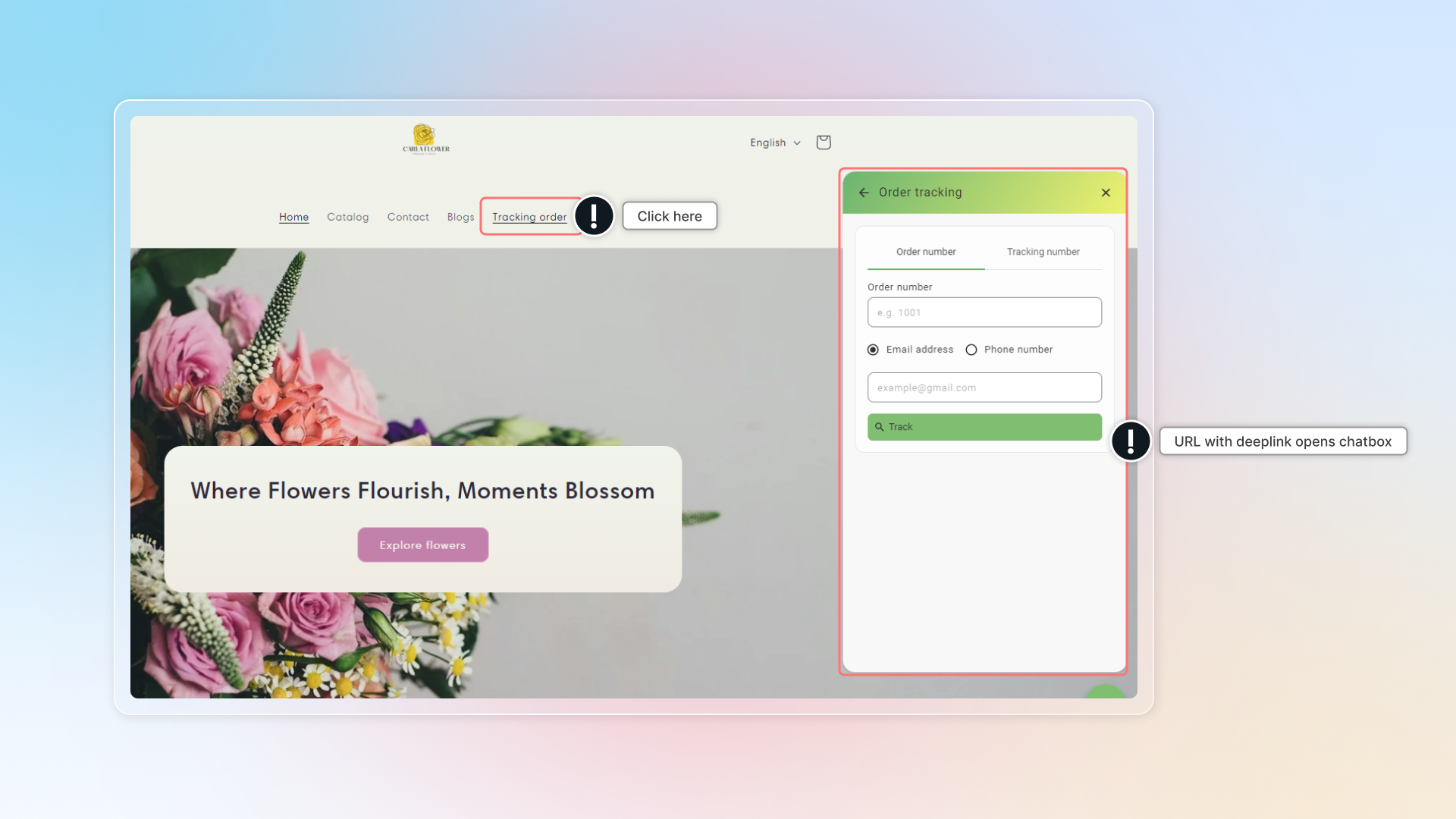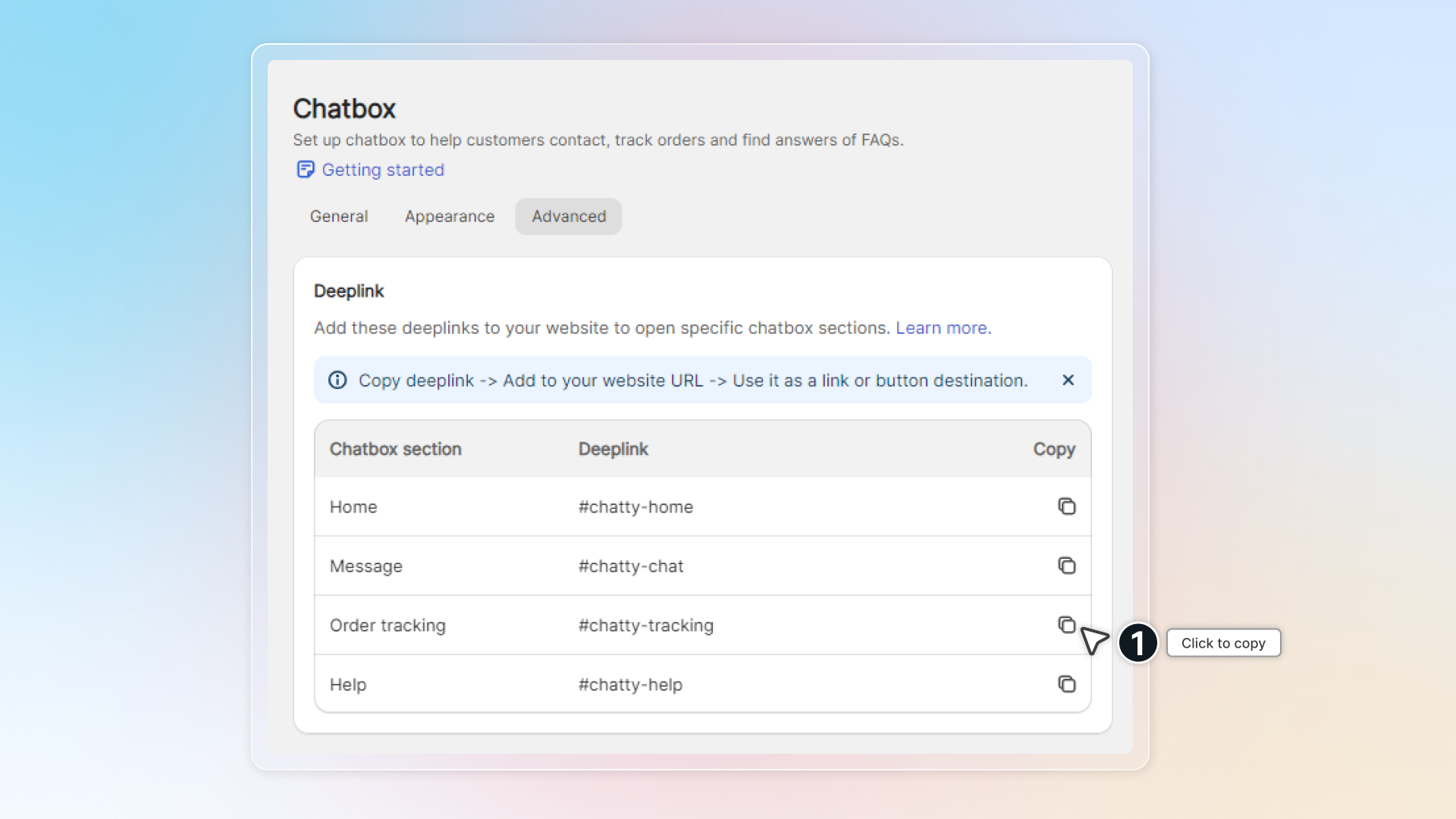 Deep links allow you to create a special URL. When this URL is clicked, it automatically opens the Chatty chatbox on your Shopify store page.