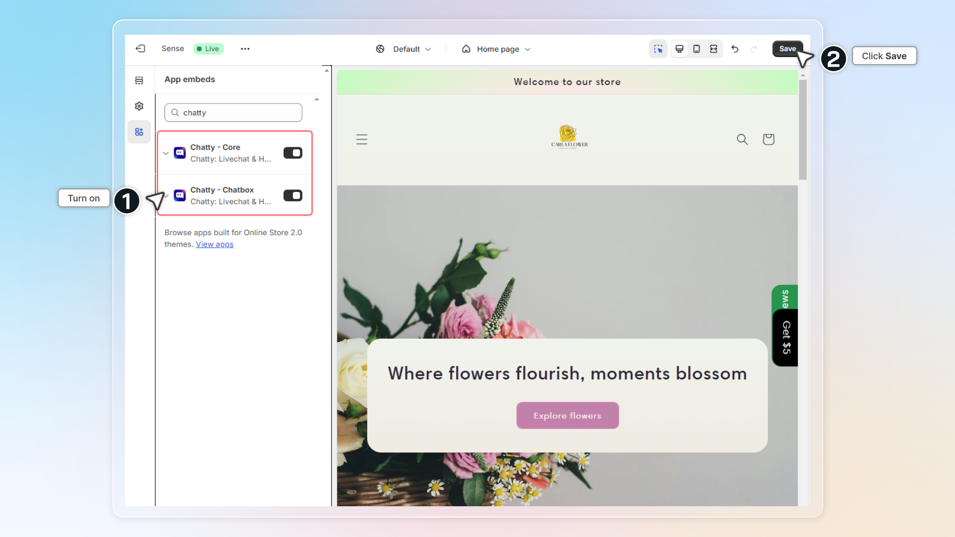 - Enable Chatty in App embed and click Save
