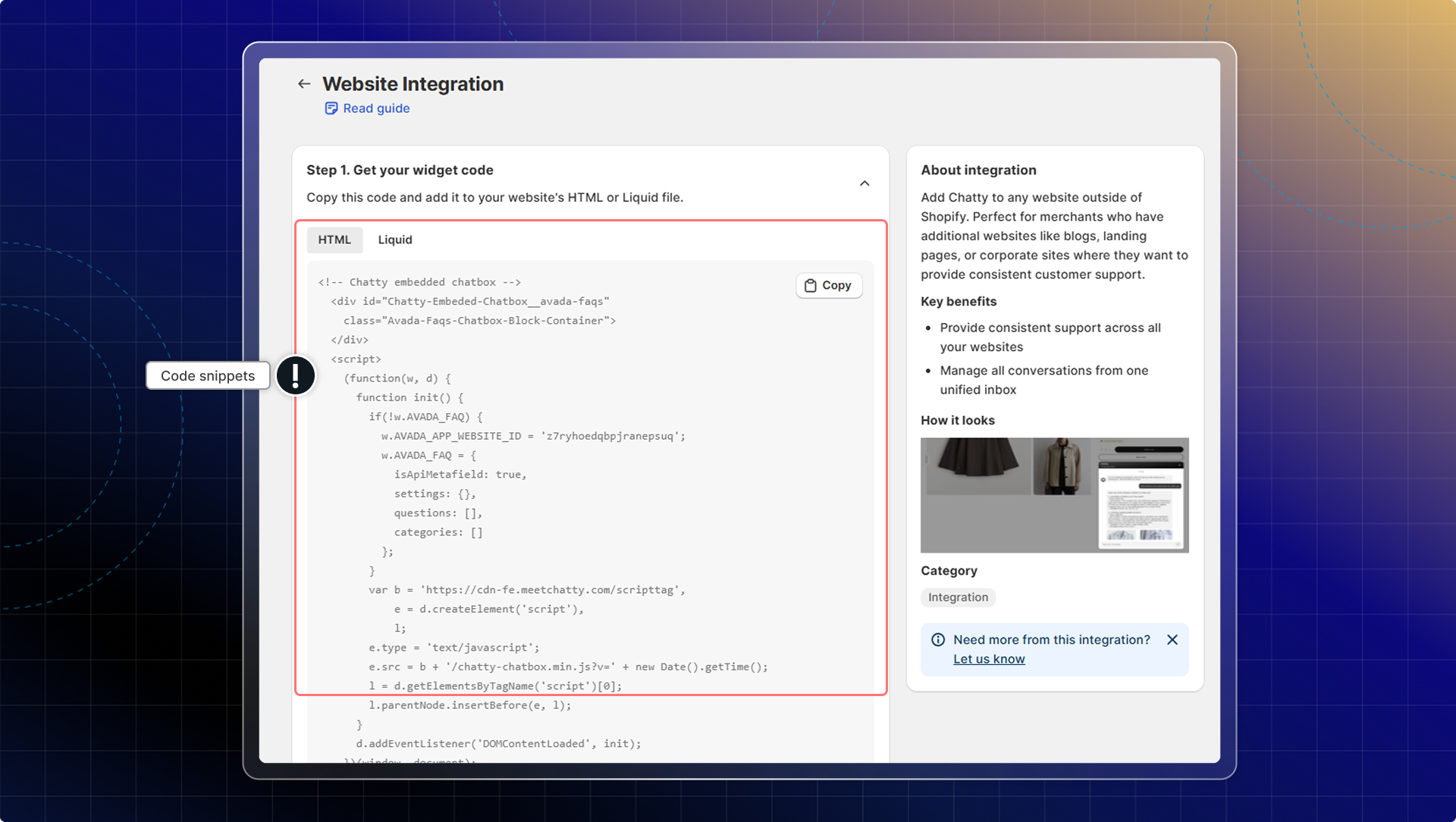 Website integration allows you to add Chatty to any website you own, even if it's not hosted on Shopify.