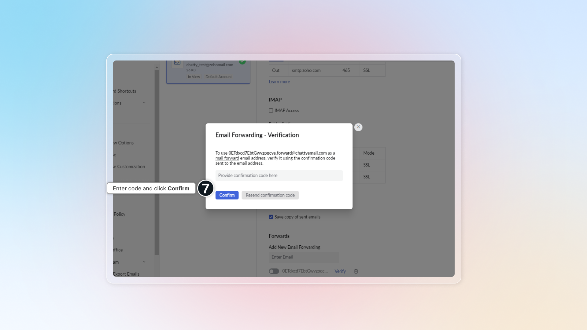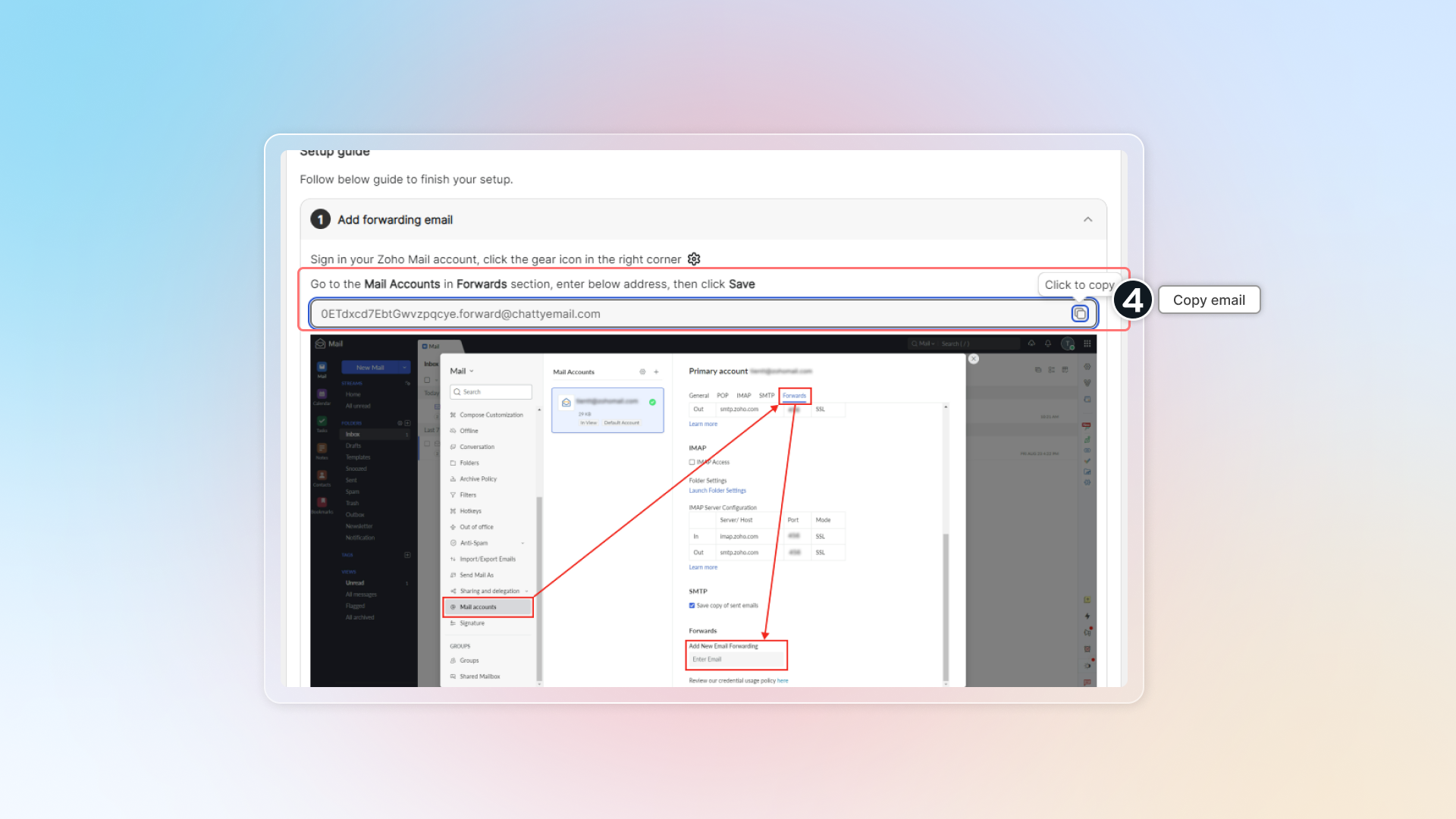 Copy forwarding email in Chatty. Paste it in "Add new email forwarding" and click Enter