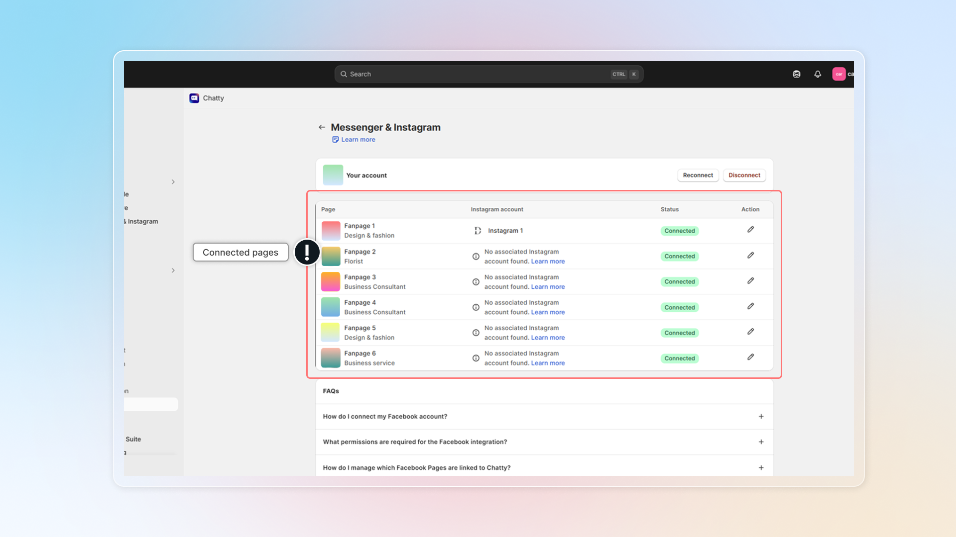 Messages from connected pages will be synced to Chatty inbox.