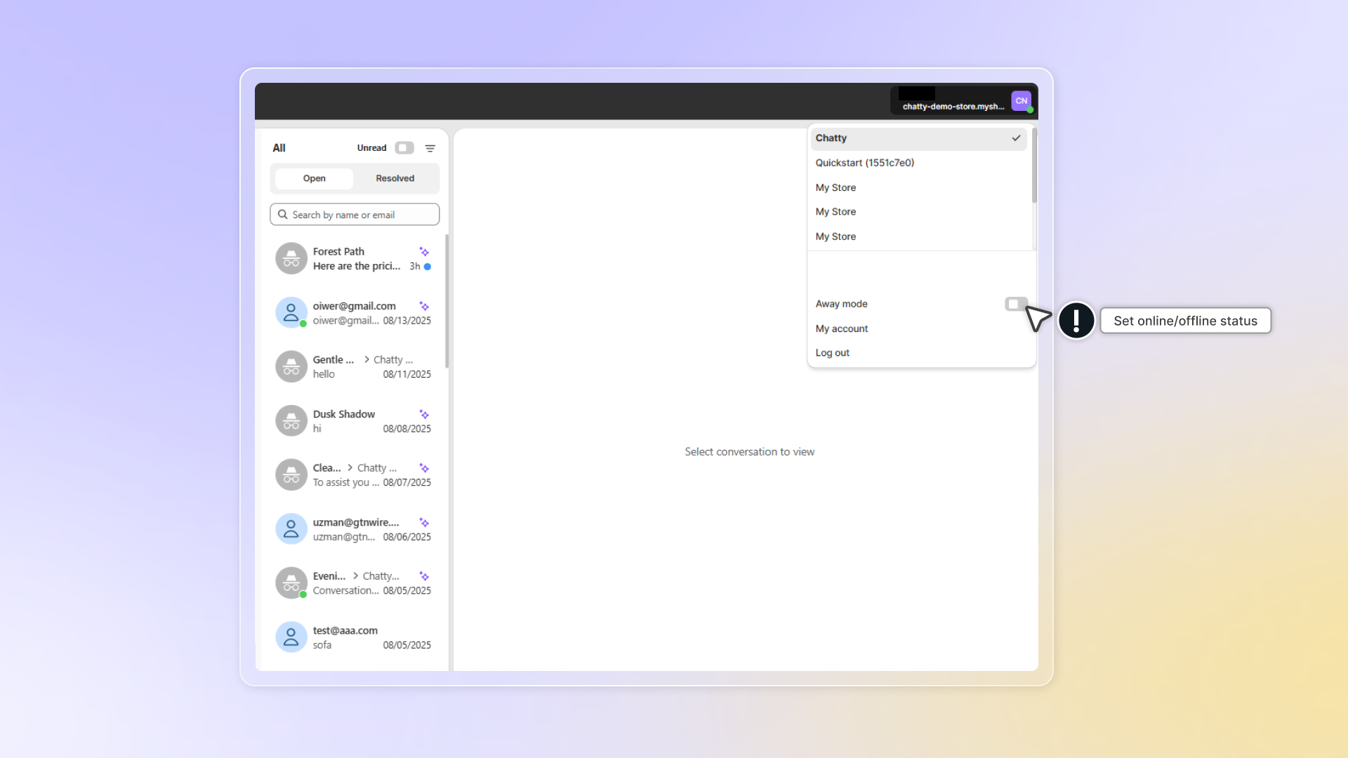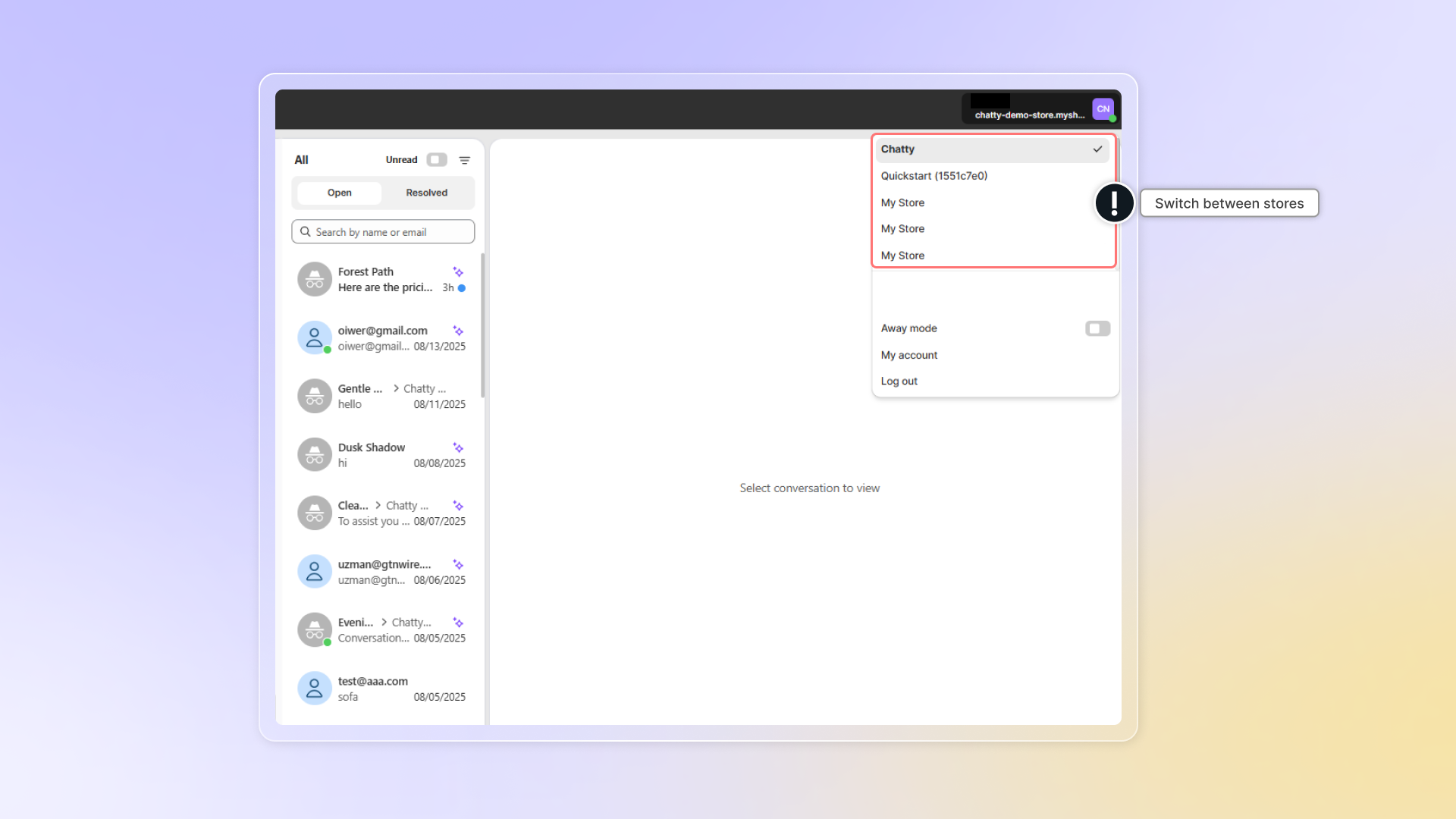 While logging in Chatty, you can switch between stores to manage conversations from different stores (that your account is linked to).