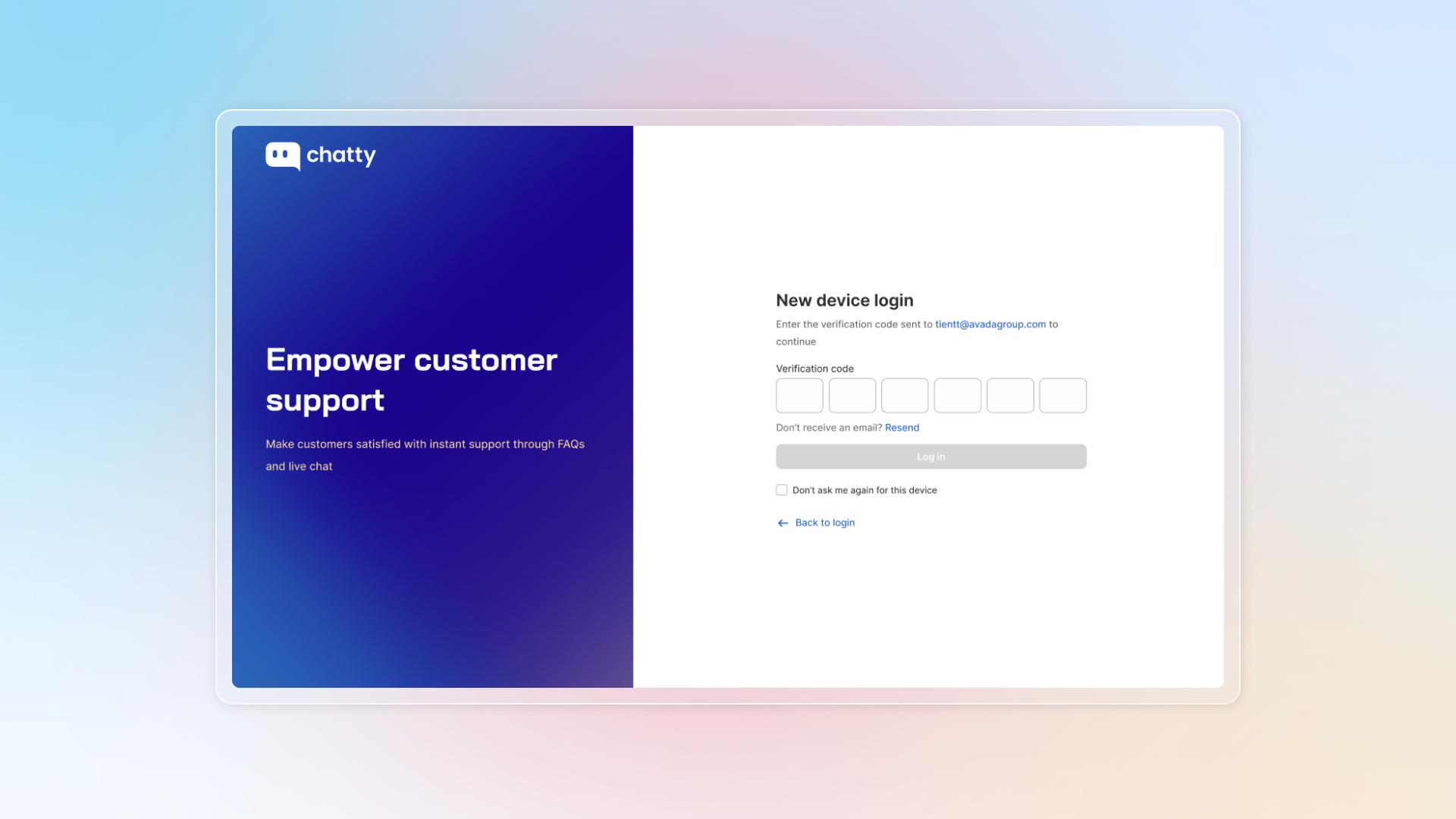 When you log in to Chatty from a new device or browser, we verify your identity using two-step verification to protect your account security.