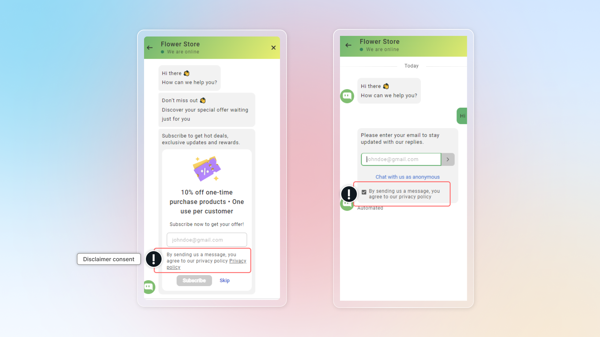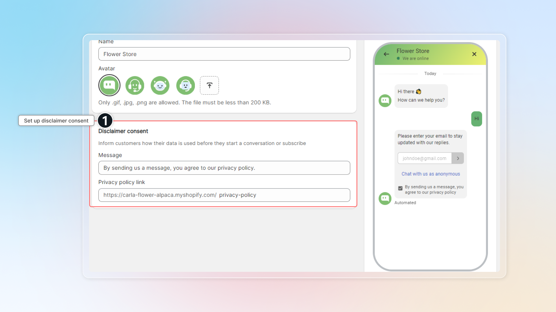 Disclaimer consent helps you to set up your privacy policy link under the email collection form in the conversation.