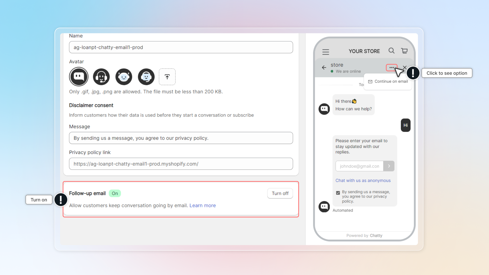 Click to turn on. In chatbox, customers can select Continue on email to keep the conversation going by their email.