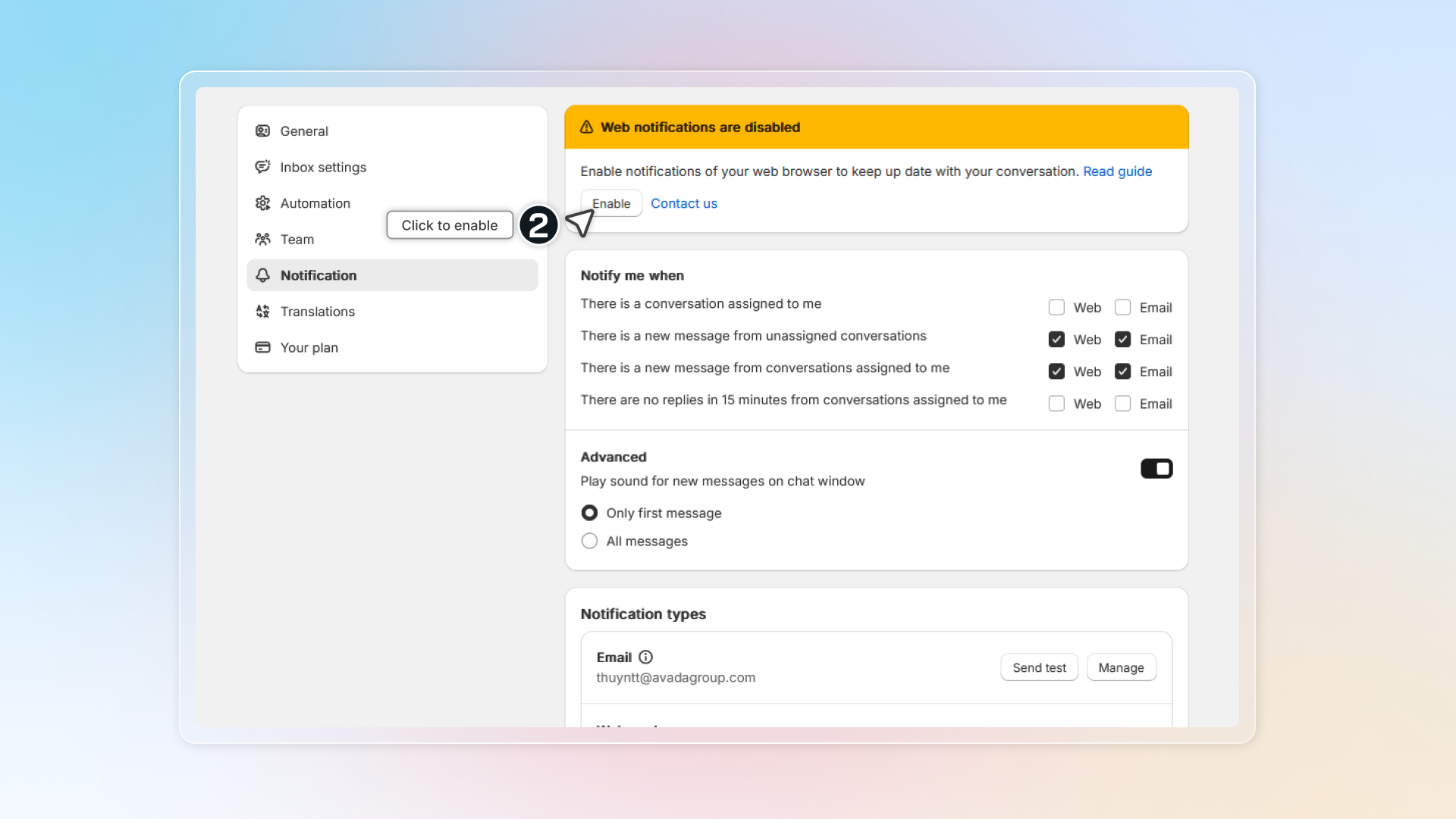 - Sound notifications (advanced): Web browser will play sound for new messages (only from end users' web browser, when you send them messages)