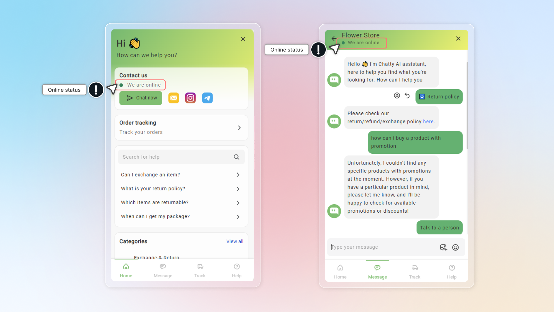 - During business hours or when any agent is online: Shows online during working hour or whenever a team member is available to chat