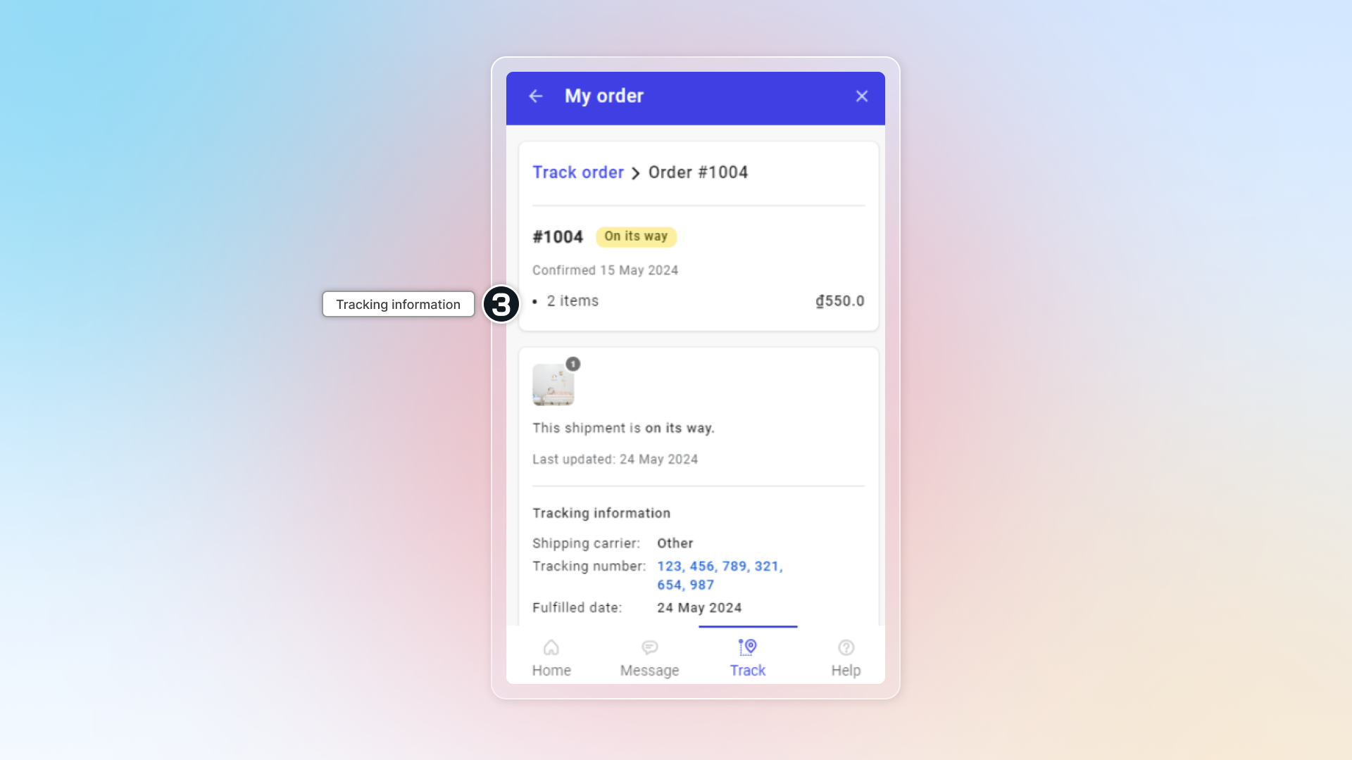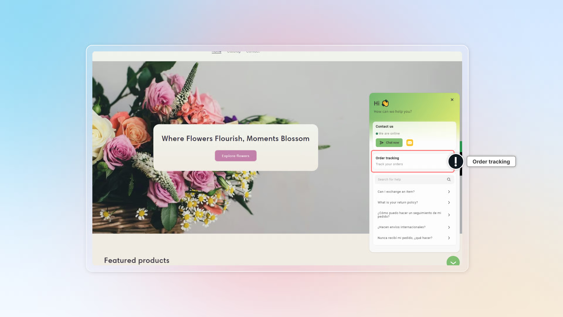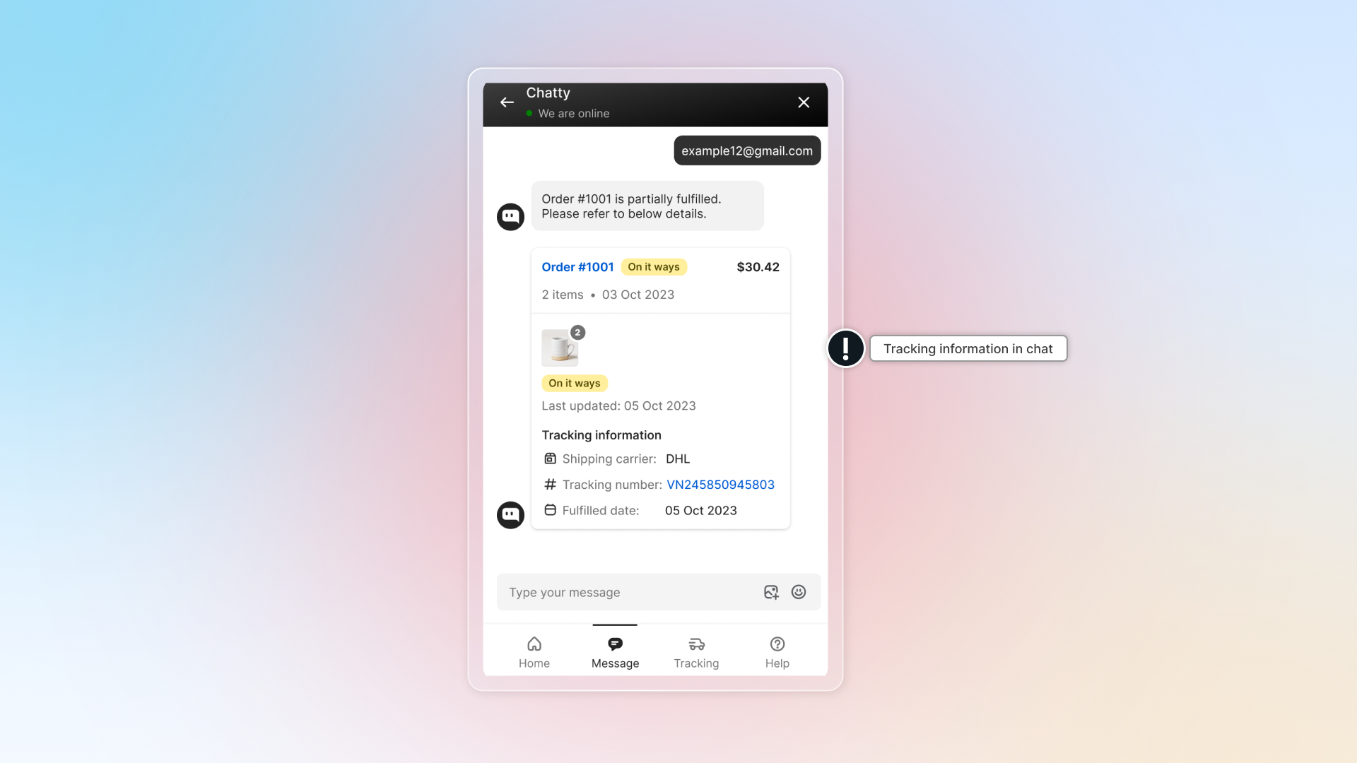 Order tracking is a self-service feature that lets customers check their order status and shipment progress directly through your chatbox.
